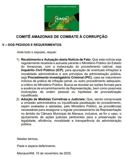 O pedido entregue ao MP-AM solicita a instauração de Inquérito Civil ou Procedimento Investigatório Criminal para apurar eventuais irregularidades e, se confirmada omissão administrativa, que sejam adotadas medidas judiciais para assegurar que o pedido de cassação seja processado adequadamente pela CMM.
