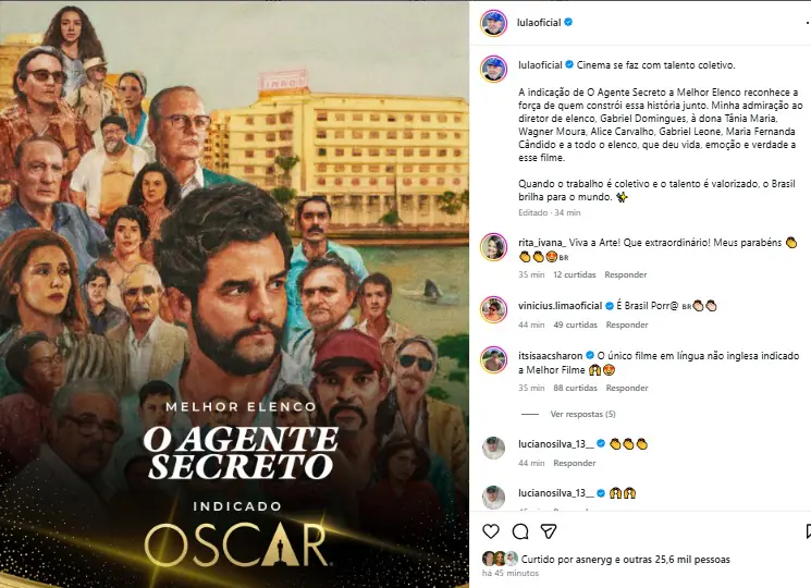 Lula também exaltou o ator Wagner Moura, indicado a Melhor Ator, lembrando conquistas anteriores do artista. “Wagner Moura tem o molho, tem talento de sobra, já levou o Globo de Ouro de melhor ator em filme drama e agora pode vir o Oscar de melhor ator”, publicou.